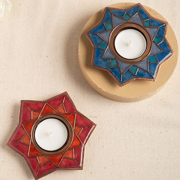 Add a touch of color, heritage and celestial elegance to your home with our newest range of star-shaped Copper Enamel Tealights, beautifully handcrafted using the age-old technique of copper enamelling. This traditional craft involves a highly skilled, technical process of fusing powdered glass onto pure copper at high temperatures (700–900°C) creating stunning, vibrant patterns that make each tealight truly one-of-a-kind.