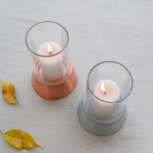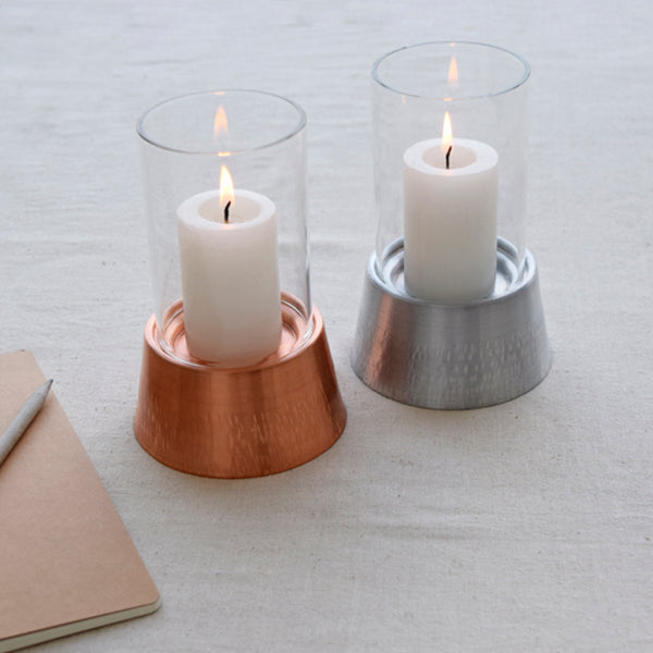 Copper with a clear lacquer coat. Chimney in glass and a candle