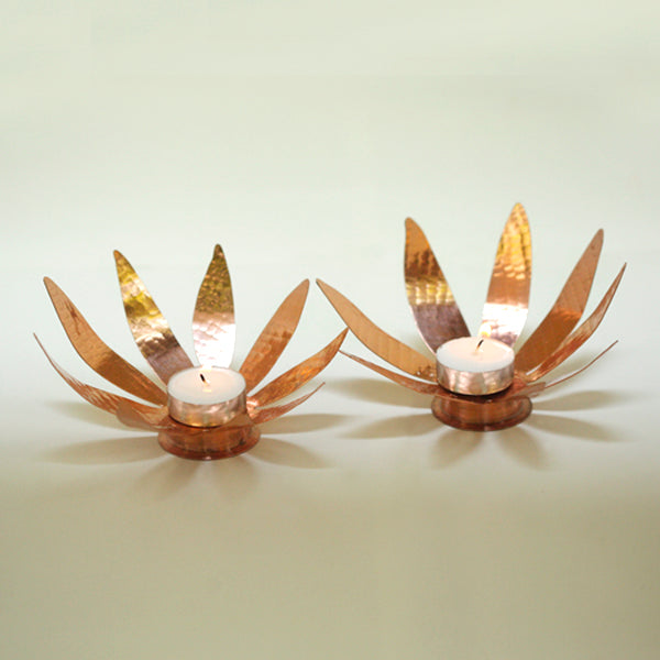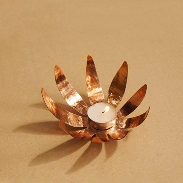 Our Sunflower Tea Light is designed to reflect the golden and orange hues of light, that fall against the copper surface. The pure copper handicraft product adds a sense of richness, making it a beautiful addition to your home decor.