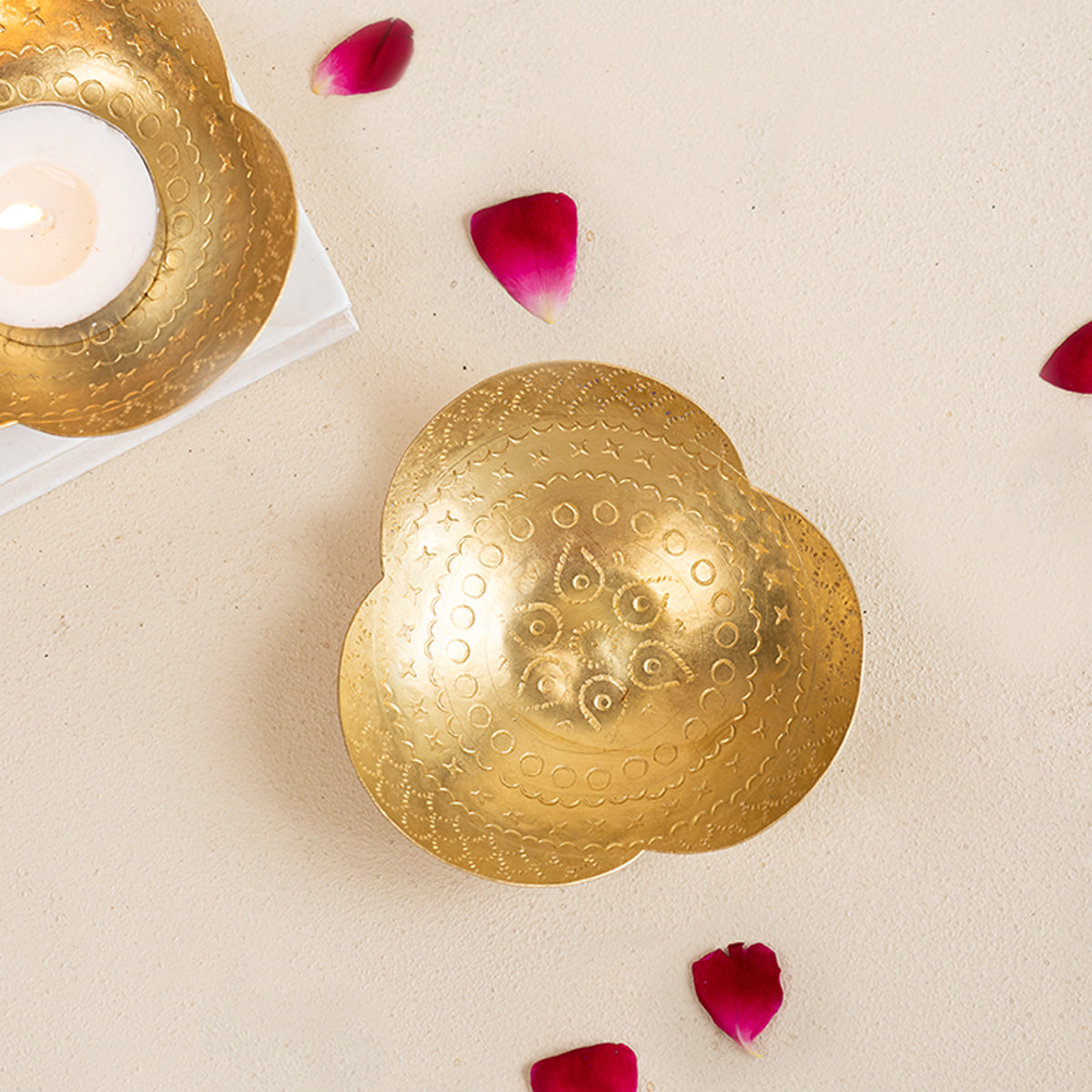 Crafted out of a superior-quality brass metal sheet using crafting traditions passed on through generations in Western India - the Wave Brass Tealight exudes a captivating shine that enhances its aesthetic appeal. Its lustrous, intricately etched surface, adds a touch of opulence to any space.
