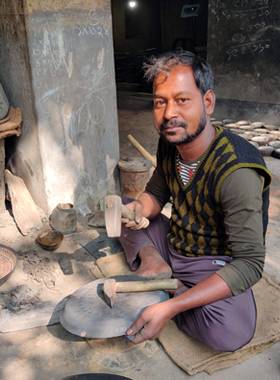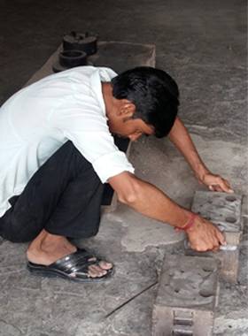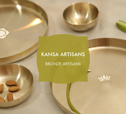 Our Kansa (Bronze) wares are made by artisans of Rajasthan, Gujarat and West Bengal. Although the material remains the same, the tools and processes differ from state to state. The West Bengal Kansa is hand forged labouriously from alloy ingots, while others are shaped and finished from a casting process. A typical Kansa karkhana will work with ingots or smelted alloys at temperatures that range from 600-1200 degrees Celsius. Shaping and finishing of Kansa requires both strength and skill, every blow of the forging hammer has to fall at the right place in order to achieve the required shape of the product.